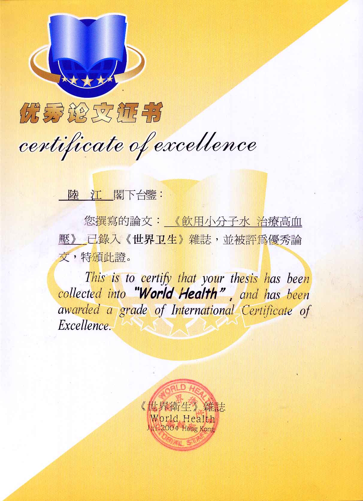 一.發(fā)明的亮點是中國基礎(chǔ)醫(yī)學(xué)研究成果的轉(zhuǎn)化醫(yī)學(xué)應(yīng)用------------------------------------------------------------------------------------ 1990年春,我50歲,發(fā)現(xiàn)患了高血壓,便及時遵醫(yī)囑服藥。我想起父輩、祖輩曾患高血壓,后來都患中風(fēng)癱瘓或心梗過世,所以心中壓力大。我夢想能根治高血壓,便研究醫(yī)學(xué)。當我檢索到中國基礎(chǔ)醫(yī)學(xué)研究成果,采用高脂餐和磁處理小分子團水飼喂小白鼠或大白免等兩組哺乳動物,經(jīng)過2、4、6個月剖殺血檢,發(fā)現(xiàn)飼喂小分子團水的試驗組動脈內(nèi)壁干凈,能減輕和延緩動脈粥樣硬化。我從這些研究成果受到啟發(fā)。覺得有責(zé)任研制出優(yōu)良的器具,讓天下人能真正治愈高血壓,消除動脈粥樣硬化,延年益壽。于是,1990年我做成樣品,先后與愛人飲用兩三個月,分別治愈了高、低血壓,之后我們的血壓都正常,癥狀消失。該水經(jīng)南京大學(xué)做核磁共振檢測為55.82赫茲的微小分子團水。該品經(jīng)工業(yè)開發(fā)后,1994年送給廣西三家三甲醫(yī)院做臨床試用4個月,再經(jīng)北京和廣西醫(yī)學(xué)專家鑒定認為:“降脂降壓效果好” ,“能擴大心腦動脈流量,改善心腦電圖和微循環(huán)” ,“對治療心腦動脈粥樣硬化、高血壓、高血脂有良好的醫(yī)療保健作用”。1996年產(chǎn)品獲得中國發(fā)明專利權(quán)。這就使產(chǎn)品可以轉(zhuǎn)化為醫(yī)學(xué)應(yīng)用,人類可逐漸改變終生服藥,自己祛除病癥。