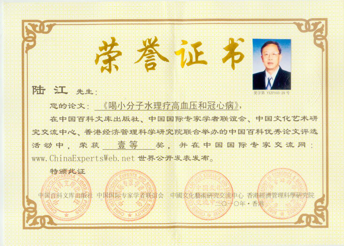 -----我是從事建筑的高工,本來沒有資格去攻克醫(yī)學(xué)難題,卻為了自身健康才扣響醫(yī)學(xué)的大門。由于我1990年患高血壓,因怕中風(fēng)才研究發(fā)明了離子水瓶,我把水處理成微小分子團水,飲用后治愈了高血壓。便于1993年底送到三家省級醫(yī)院做臨床試用4個月。經(jīng)北京和廣西醫(yī)學(xué)專家鑒定:"降脂降壓效果好"," 能擴大心腦動脈流量,改善心腦電圖以及微循環(huán)","對治療心腦動脈粥樣硬化、高血壓、高血脂有良好的醫(yī)療保健作用。""產(chǎn)品的技術(shù)性能和療效達到了同類產(chǎn)品的國內(nèi)領(lǐng)先水平,經(jīng)廣西醫(yī)學(xué)科學(xué)情報研究所檢索,未見國外有類似報道。"中國醫(yī)學(xué)科學(xué)院張正國教授從美國國立醫(yī)學(xué)圖書館數(shù)據(jù)庫存Medline檢索英俄文資料,均未見類似報告。2000年上市后,我為了對消費者負責(zé)而繼續(xù)觀察研究,一直通過《信譽卡》和《質(zhì)量跟蹤調(diào)查書》向患者承諾療效,請用戶使用6個月后反饋效果。和脂壓患者飲用2至5個月內(nèi),消除癥狀,停服藥物,血壓正常;冠心病患者飲用3~5個月逐漸減輕至消除心絞痛、房顫等癥狀,不再服藥,飲用1年左右心電圖正常,經(jīng)冠脈造影掃描無明顯狹窄,表明冠心病痊愈。大量患者還反映許多衰弱器官被修復(fù),讓前列腺增生、慢性咽喉炎、慢性氣管炎、支氣管炎、慢性胃炎、腸炎和膽囊炎等不藥而愈;2型糖尿病患者是因為胰島衰弱致病,飲用該水半年至一年,逐漸減藥至停藥,血糖尿糖正常,真正治愈2型糖尿病。中風(fēng)后遺癥患者飲用六七個月,可逐漸減輕至消除肢體和語言障礙,表明飲用該水能讓壽命很長的神經(jīng)元細胞逐漸修復(fù),奇跡般地恢復(fù)肢體和語言功能。飲用后還使胸腺和脾臟兩個重要的免疫器官被修復(fù)和增強,產(chǎn)生免疫細胞多,提高了免疫力,使人不生病或少生病。自此, 飲用微小分子團水創(chuàng)造了攻克冠心病、高(低)血壓和糖尿病三大醫(yī)學(xué)難題的奇跡。人們對此感到不可思議,但實踐是檢驗真理的唯一標準。