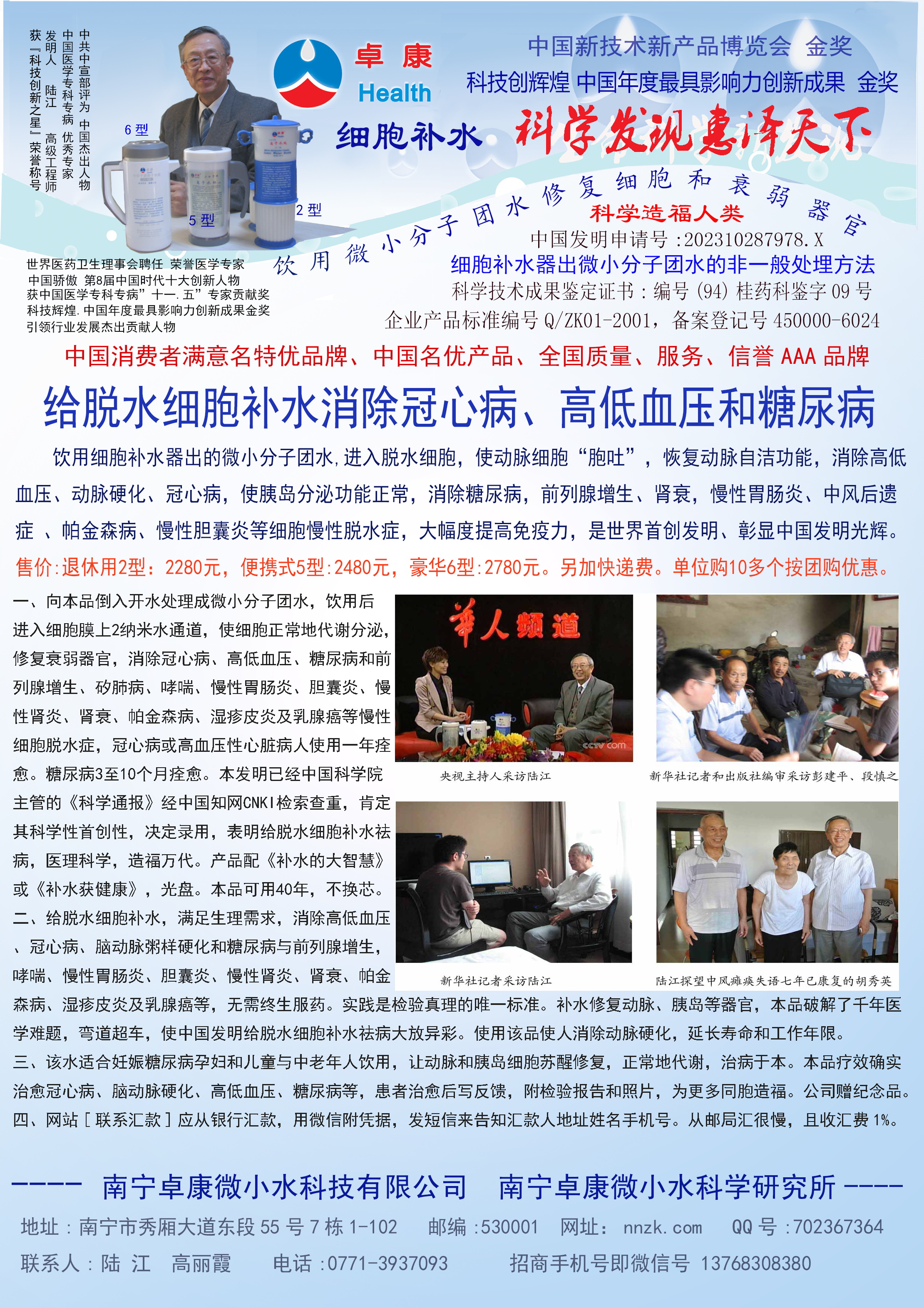人類幾千年來患以上病癥需終生服藥,幾十年也不能治愈。可是我國南寧的高級工程師陸 江,于1990年想根治高血壓,研究發(fā)明了離子水瓶,處理出微小分子團水供飲用,經(jīng)過醫(yī)院臨床試用和專家鑒定,1999年獲中國發(fā)明專利權(quán),產(chǎn)品于2000年投放市場后一直跟蹤調(diào)查,據(jù)全國各地用戶反饋:祛除了高低血壓、糖尿病和冠心病,并使前列腺增生、咽喉炎、鼻竇炎、慢性氣管炎、支氣管炎、矽肺病、哮喘、慢性胃炎、腸炎、慢性膽囊炎、慢性腎炎、腎衰、膀胱炎、便秘、痔瘡、風(fēng)濕性關(guān)節(jié)炎和濕疹皮炎及中風(fēng)后遺癥等病癥不藥而愈。為什么喝微小水能治20多種???陸 江從1991年德國科學(xué)家發(fā)現(xiàn)細胞膜水通道僅為2納米獲得啟發(fā),認為多種器官患病是因細胞脫水,不能正常代謝和分裂增殖,才使器官細胞減少致衰弱萎縮而形成細胞缺水性病癥。22年來的實踐有力地支持了“細胞脫水致病”這一重要論點,表明喝微小水可滿足細胞的生理需求,補水就能祛病,是生命科學(xué)新亮點。